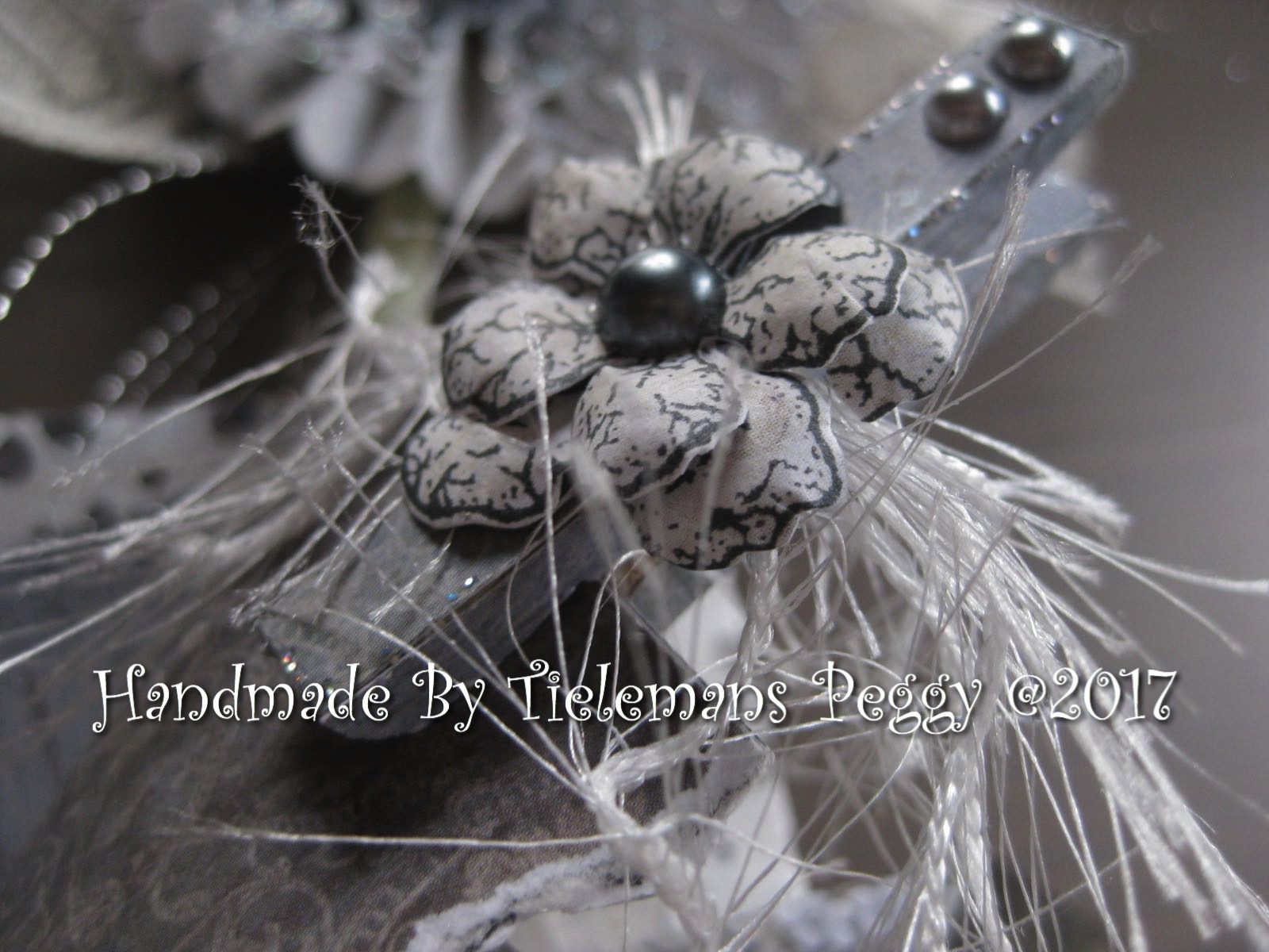 Make two tags with papers from the collection and decorate them with quotes you like from the HC papers. Add lace, ribbon and a flower on the top of the tag made with the Arianna blooms stamp and die. Put both tags in the envelope. Make a big flower and use some lace and sparkling ribbon attach the flower on a straw. Make a bow and a windmill and also attach them on a straw. Glue papers from the collection on a little clothe peg, make a little flower and glue this on the peg. Attach the peg on the envelope.